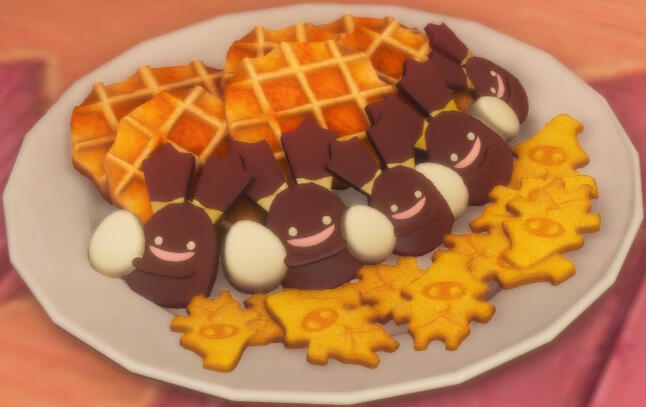 Bubble and Pearl Chocolate Bonbons - Poms, bonbons, orbs... tiny little spheres of milk or white chocolate made as a light treat!(Bubble Chocolate/Pearl Chocolate)Tart, Tart Mountain - A veritable mountain of sweetness! Not a big mountain, though. Layers of sugary cream and chestnut make up this tiny, tasty peak! (Sohm Al Tart)Tasty Torte - A rich chocolate gateau filled with apricot jam and buried in icing. (Sachertorte)Rolanberry Round - What's better than a cheesecake? A ROLANBERRY cheesecake! Don't those swirls look delicious? (Rolanberry Cheesecake)(Choco) Spriggan & Waffles - A fresh tray of cookies, in spriggan, waffle, and cute little guy shapes and flavors! I have no idea what flavor the cute little guys are. (Bubble Chocolate and Hatching-tide Confections furniture placement)